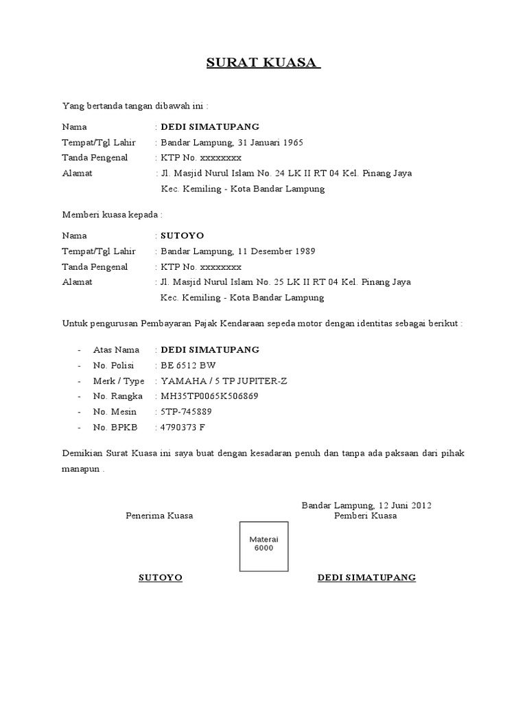 Contoh Surat Kuasa Pembayaran Pajak Motor 5 Tahunan - Contoh Surat Kuasa Pembayaran Pajak Motor 5 Tahunan ... : Contoh surat kuasa merupakan surat yang tujuan dibuatnya adalah untuk memberikan suatu kuasa atau wewenang contoh surat kuasa pengambilan bpkb motor / mobil.. Untuk mendapatkan file contoh surat kuasa pengambilan bpkb stnk motor mobil yang tidak diproteksi dan bebas untuk diedit, silahkan anda kunjungi situs kami. Contoh surat kuasa pembayaran pajak motor Selanjutnya pembuatan surat kuasa pembayaran pajak sepeda motor juga harus disertai dengan adanya materai 6.000 pada bagian tanda tangan kedua. Wewenang diberikan sebagai tanda kepercayaan anda untuk diwakili saat pembayaran pajak kendaraan. Contohsuratindonesia.com kali ini memberikan contoh.